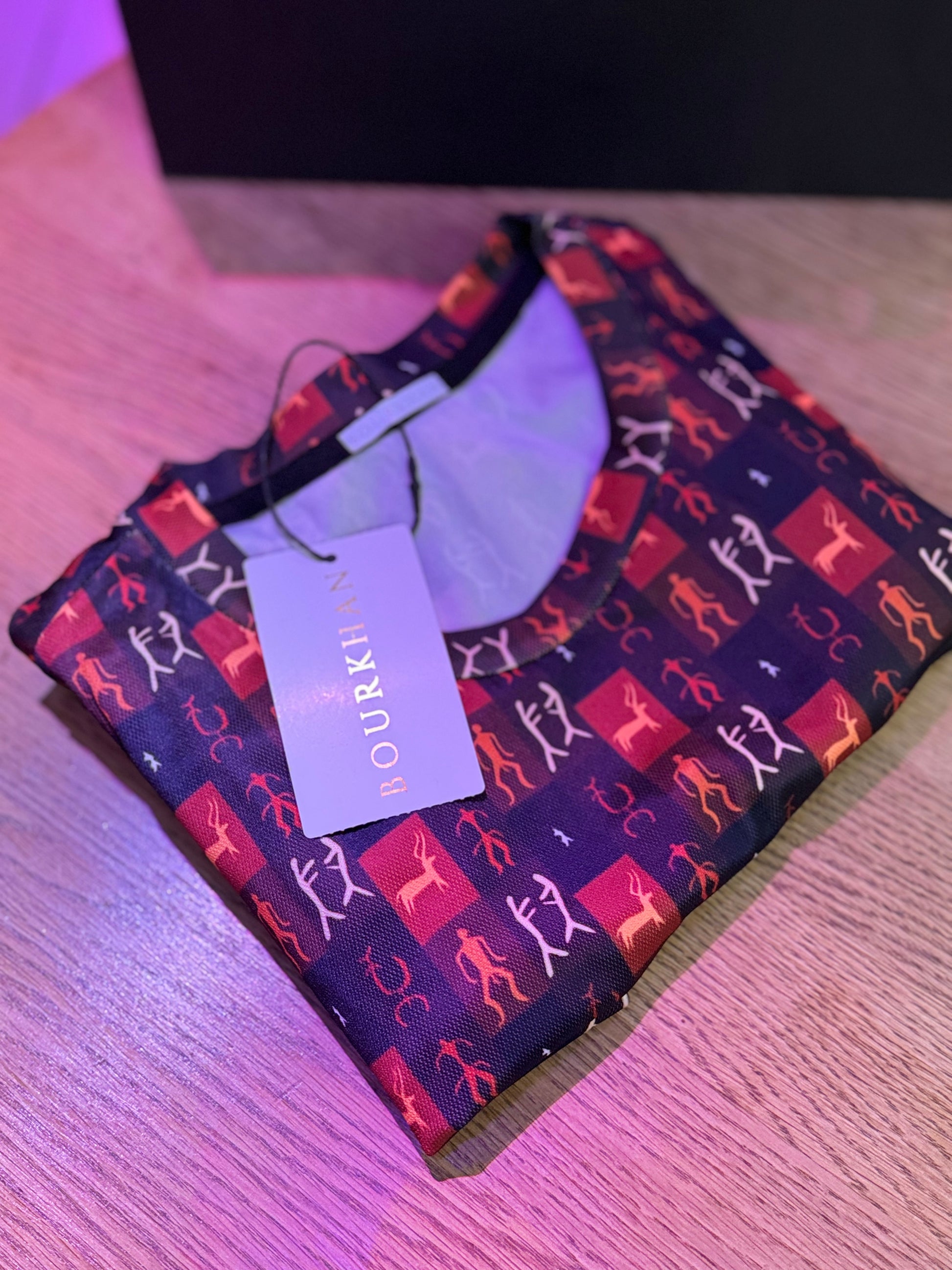 Enjoy the perfect blend of comfort and durability with the BOURKHAN Premium Polyester T-Shirt Made from high-quality polyester fabric this shirt offers a sleek fit and lasting wear Featuring exclusive petroglyph-inspired designs it brings artistic elegance to everyday style Ideal for those who value both performance and refined aesthetics Elevate your casual look with a modern statement piece